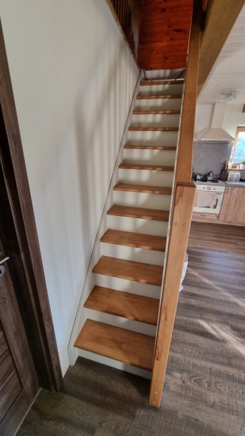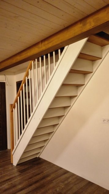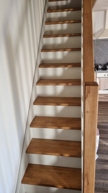 Der Kunde wählte für seine Treppe in seinem neu renovierten Haus in der Nähe von Halle viele Sonderausführungen, als er uns den Auftrag erteilte. Er entschied sich für eine geschlossene Treppe aus weißer Buche als Basis und lieferte uns die gemessenen Maße der Treppe in Höhe, Grundriss und Breite, damit sie genau zwischen den ersten Stock und die Tür im Erdgeschoss passt. Die Stufen und der obere Handlauf aus Buche wurden mit Öl in einem vom Kunden gewählten Farbton behandelt, und die strukturellen Seiten der Treppe sowie der untere Teil des Quergeländers wurden mit weißer Farbe behandelt. Der Kunde wollte so wenig Arbeit wie möglich mit dem Einbau haben und bestellte daher die Lieferung der bereits montierten Treppe zusammen mit dem montierten Handlauf. In seinem Haus musste er nur noch die Treppe an der Decke und den Handlauf am Boden befestigen.