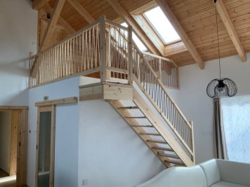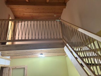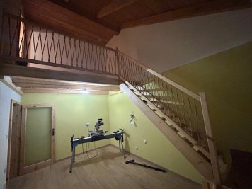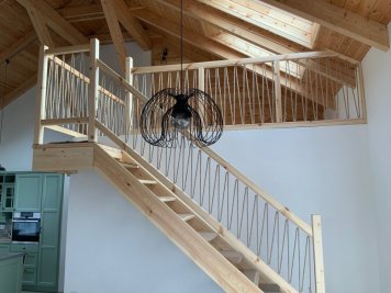 Der Kunde bestellte zwei Treppen für sein Häuschen in der Nähe von Tynec nad Sazavou. Gemeinsam mit uns löste er die Verankerung des Treppenabsatzes, die durch einen kleinen Galgen, der hinter den Verkleidungsbrettern versteckt ist, gelöst wird. Die Treppe hat zwei Podeste und der Stolz der Treppe und des Bodens ist der Handlauf. Unsere Fertigung ist nur der obere und untere Handlauf und der Kunde hat die Seilfüllung mit den in die Handläufe geschraubten Ösen selbst montiert. Die zweite Treppe ist ähnlich ausgeführt, nur einfacher und geradliniger.